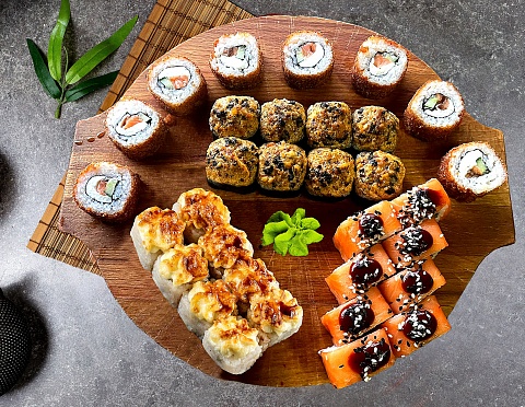 • Дуэт люкс (8 кус, холодный) - рис, нори, лосось, тигровая креветка, краб, огурец, соус шрирача, кунжут